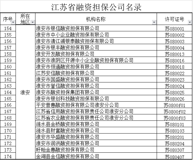 2019年12月30日,江蘇省地方金融監(jiān)管局公布《江蘇省融資擔(dān)保公司名錄》、《江蘇省再融資擔(dān)保公司名錄》,全省持有融資擔(dān)保業(yè)務(wù)經(jīng)營許可證299家融資擔(dān)保、再擔(dān)保公司(含73家分公司)名單予以公布。